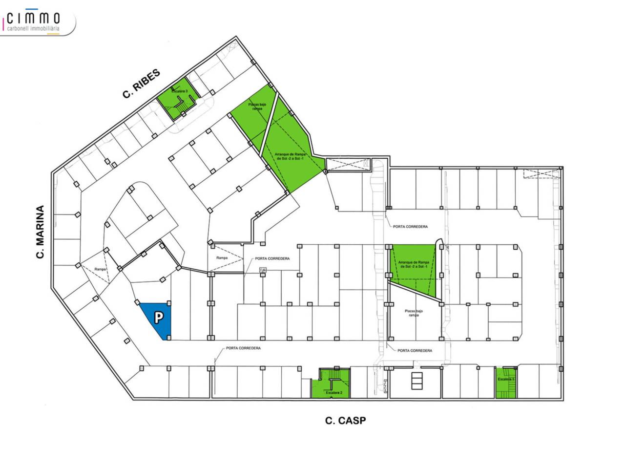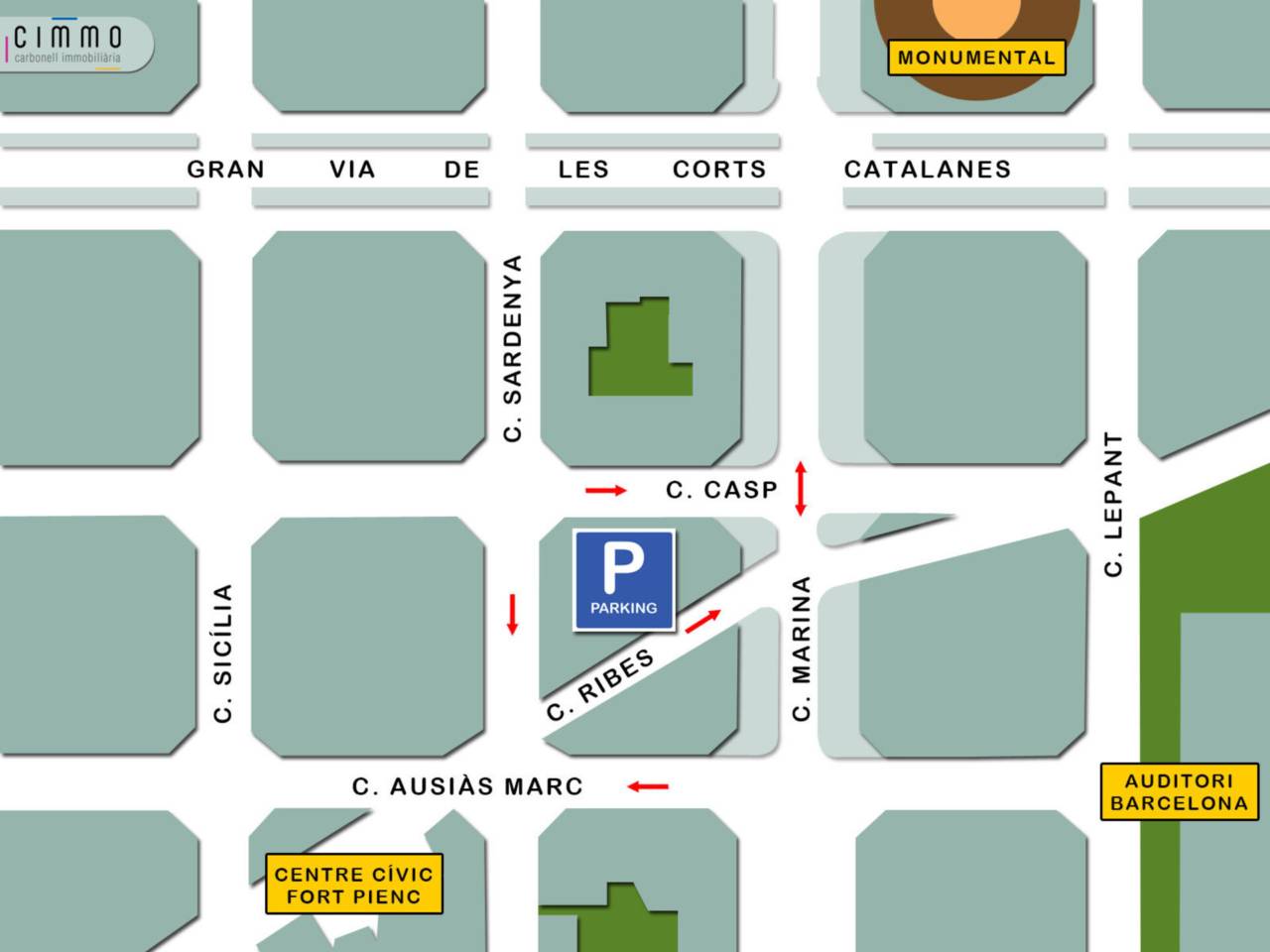 Pàrquing de lloguer Eixample (Fort Pienc): c/ Casp entre c/ Marina i c/ Sardenya. Molt a prop de l’Auditori de Barcelona i del Centre Cívic Fort Pienc. Té una superfície de 9 m² en forma triangular (veure mides en fotos i plànol). Apta per a cotxe mitjà. Situada a planta soterrani -2. Sistema de seguretat. Porta automàtica. S'hi pot entrar o sortir tant pel carrer Casp com pel carrer Ribes. Finca construïda el 1979. Ref. L-7295 És imprescindible fer la visita amb el vehicle que aparcarà a la plaça de pàrquing per comprovar si la maniobra, l'espai d'aparcament i els accessos s'ajusten a les vostres necessitats.