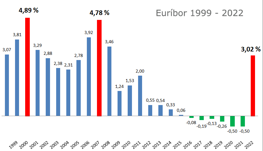 L’euríbor ha anat baixant des del 2008, on va tenir un dels seus màxims històrics i va provocar la segona gran crisi a nivell hipotecari. Al 2022 ha tingut un creixement espectacular passant d’un índex per sota de zero al 3,02% fet que ha disparat el preu de les hipoteques. Alguns analistes apunten que, feta la última revisió de l’euríbor a 12 mesos, podria arribar fins i tot al 4%