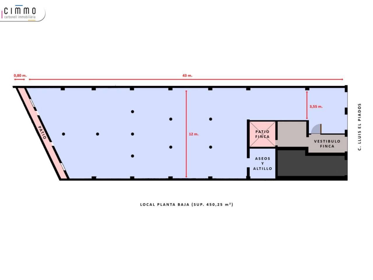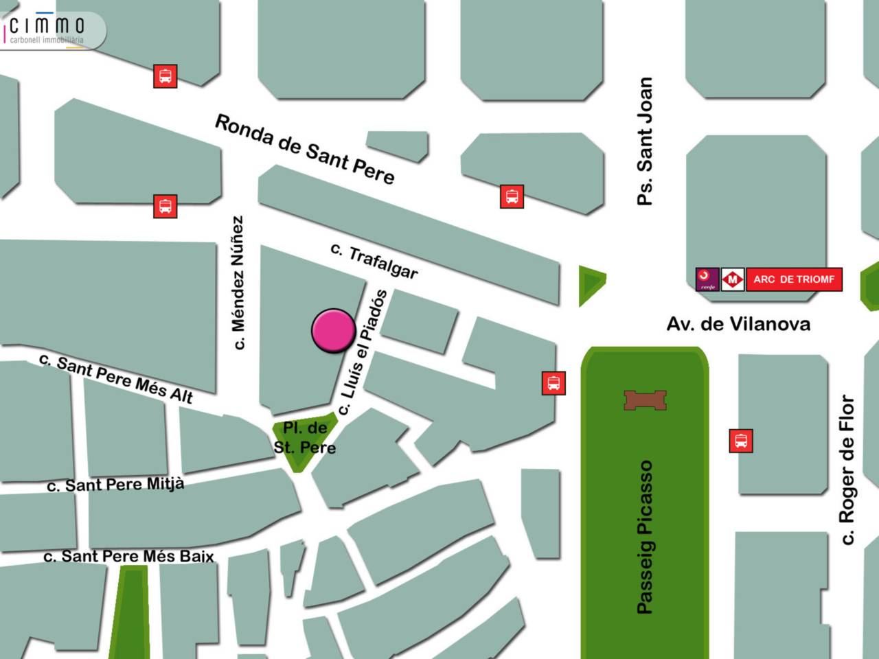 Local comercial en el barrio de Sant Pere - Santa Caterina y la Ribera (Ciutat Vella), en c/ Lluís el Piadós, buena zona junto al eje comercial de c/ Trafalgar y próximo al Passeig de Lluís Companys. A pie de calle, amplio y muy espacioso. Su última actividad comercial ha sido como sede de una empresa de reparto de paquetería. Tiene una superficie de 486 m² (450 m² útiles). Dispone de garaje cerrado de 31 m² (3,40 metros de ancho y 9,20 metros de fondo) con salida directa a la calle. Gran espacio diáfano de aproximadamente unos 43 metros de fondo y 12 metros de ancho. Dos oficinas con separaciones por mamparas (2 metros de ancho por 20 metros de largo). Columnas de hierro. Dispone de tres aseos. Suelos de terrazo. Patio interior de 17 m². Fachada de 6 metros. Acceso directo desde la calle y por el vestíbulo de la finca. Cierre mediante persiana metálica automática. Suministros dados de alta. La instalación eléctrica es reciente. Edificio construido en el año 1890. Muy bien comunicado por autobuses y a cuatro minutos caminando de la estación de “Arc de Triomf” (metro L1 y trenes de cercanías RENFE). Etiqueta de calificación energética: C. Condiciones: Fianza de dos meses. Se requiere solvencia demostrable mediante nómina o renta. Ref. L-2059 Recomendamos consultar en las oficinas municipales el tipo de licencia necesaria para su negocio, antes de realizar la visita al local.